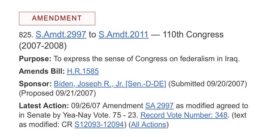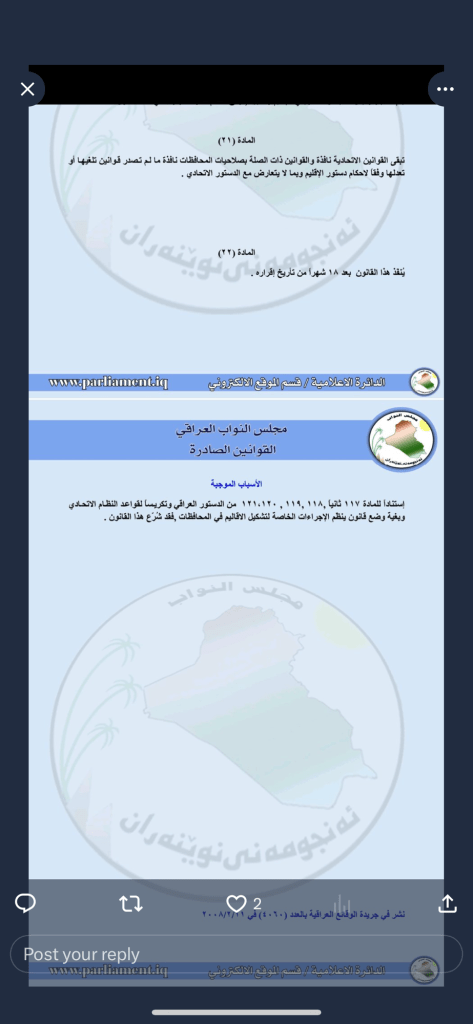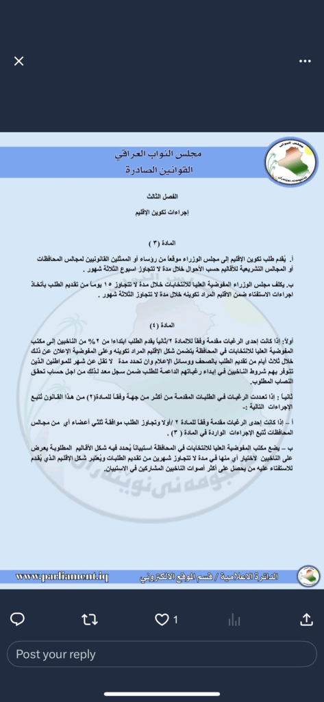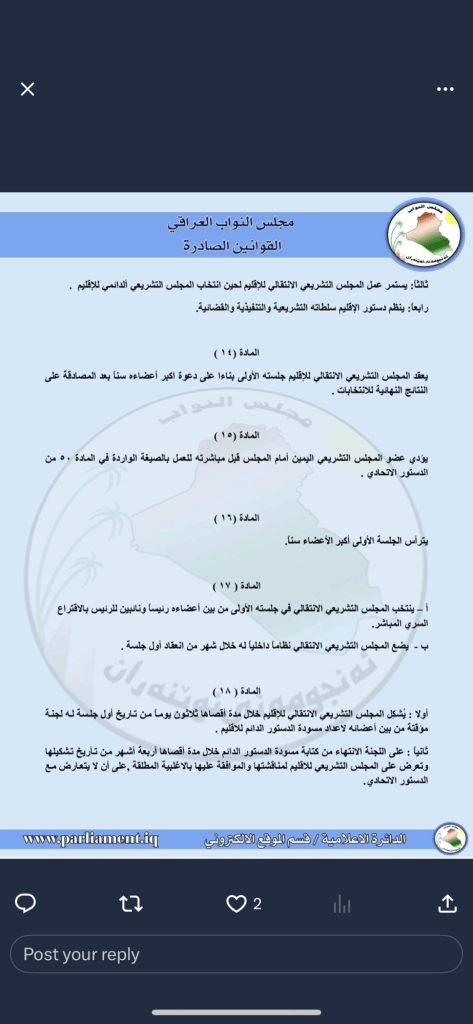 العراق بدستوره الحالي يتضمن مواد تحقق نظام الأقاليم للدولة العراقية. واحد من هذه الأقاليم تحقق فعلا وأثبت بمرور السنوات ان اقليم كردستان يحقق مطالب الشعب الكردي ولا يصطدم مع مطالب المركز الحكومة والبرلمان العراقي