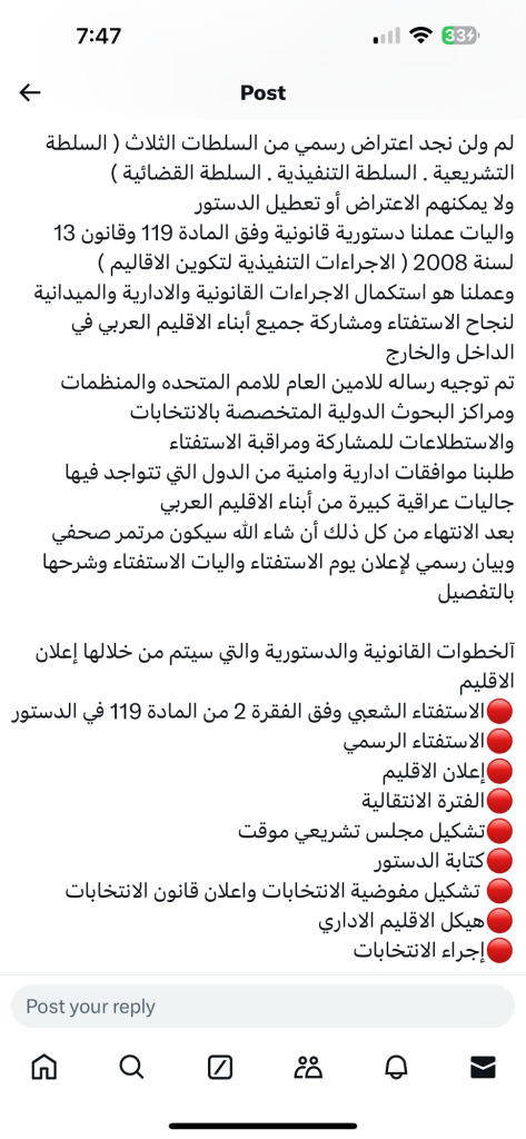 الاستفتاء بالموافقة سوف يعطي الشرعية للبدء بالخطوات القانونية التي تلي الاستفتاء ولعل نموذج اقليم كردستان سوف يكون الأقرب للإقليم العربي من حيث تشكيل حكومة الإقليم وعمل برلمان الإقليم وتشكيل قوات أمنية لحماية الإقليم